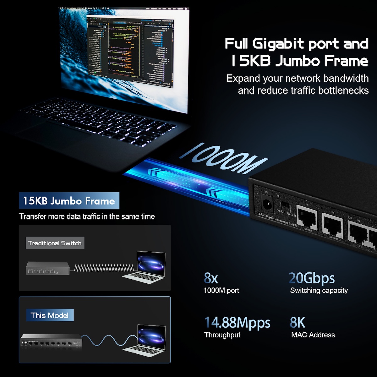 - 10 x 1 Gigabit Ports - Includes 8 x 1 Gigabit ethernet ports, 2 x 1 Gigabit Uplink Ports, all ports support 10/100/1000Mbps rate. The total bandwidth is 20Gbps, and each port can achieve gigabit rate